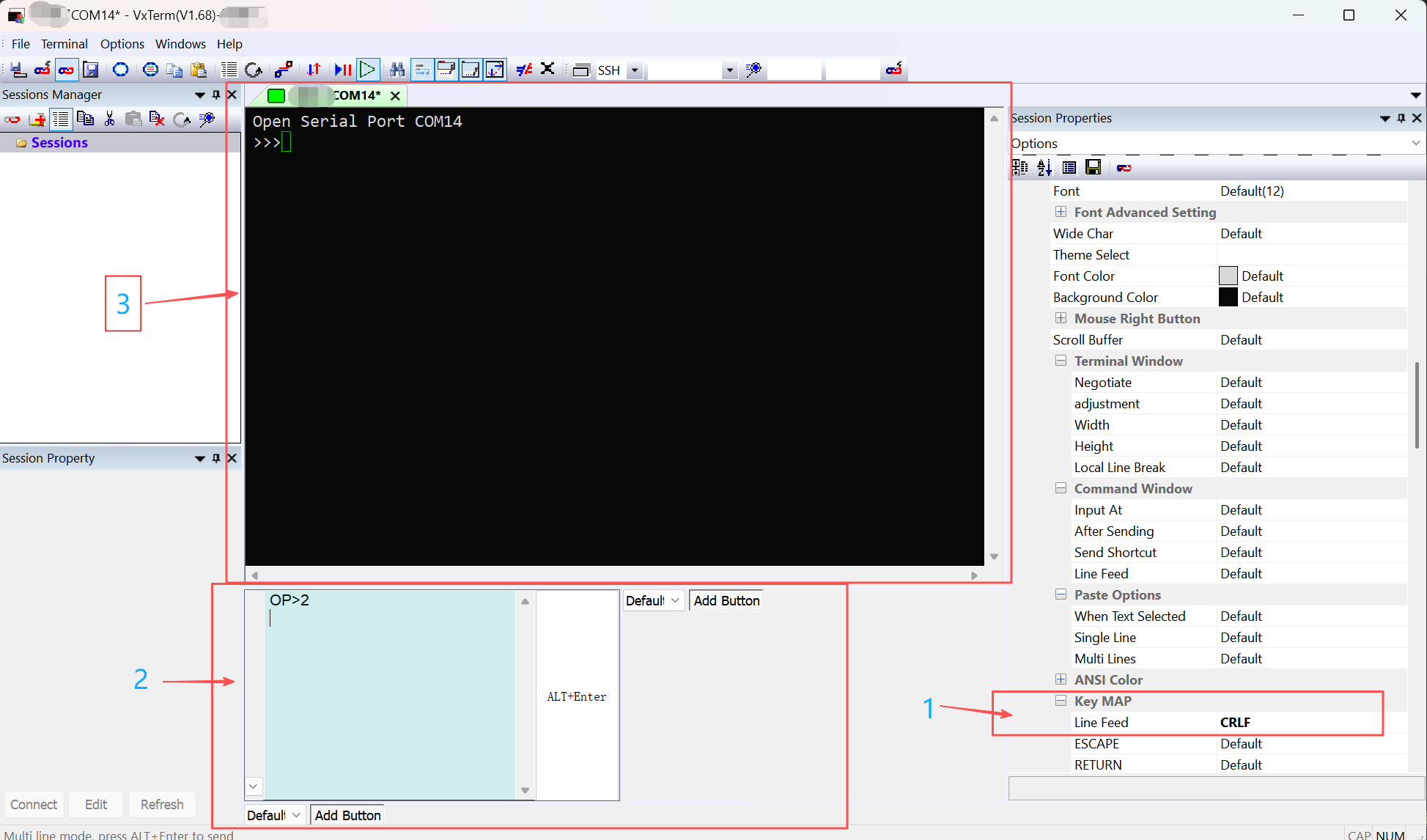 session properties找到Key MAP中的Line Feed,将内容改成CRLF。 - 在命令窗口中输入