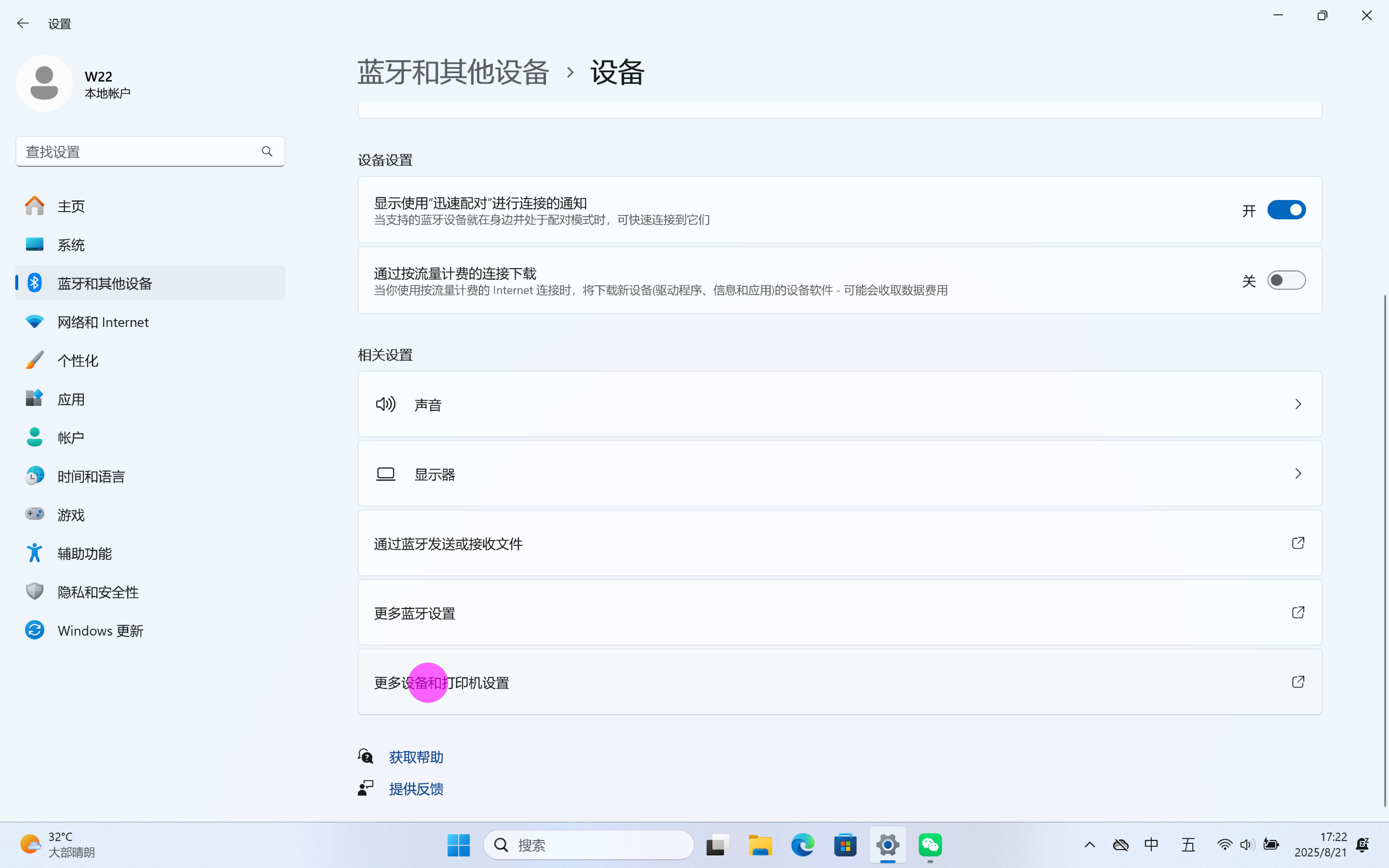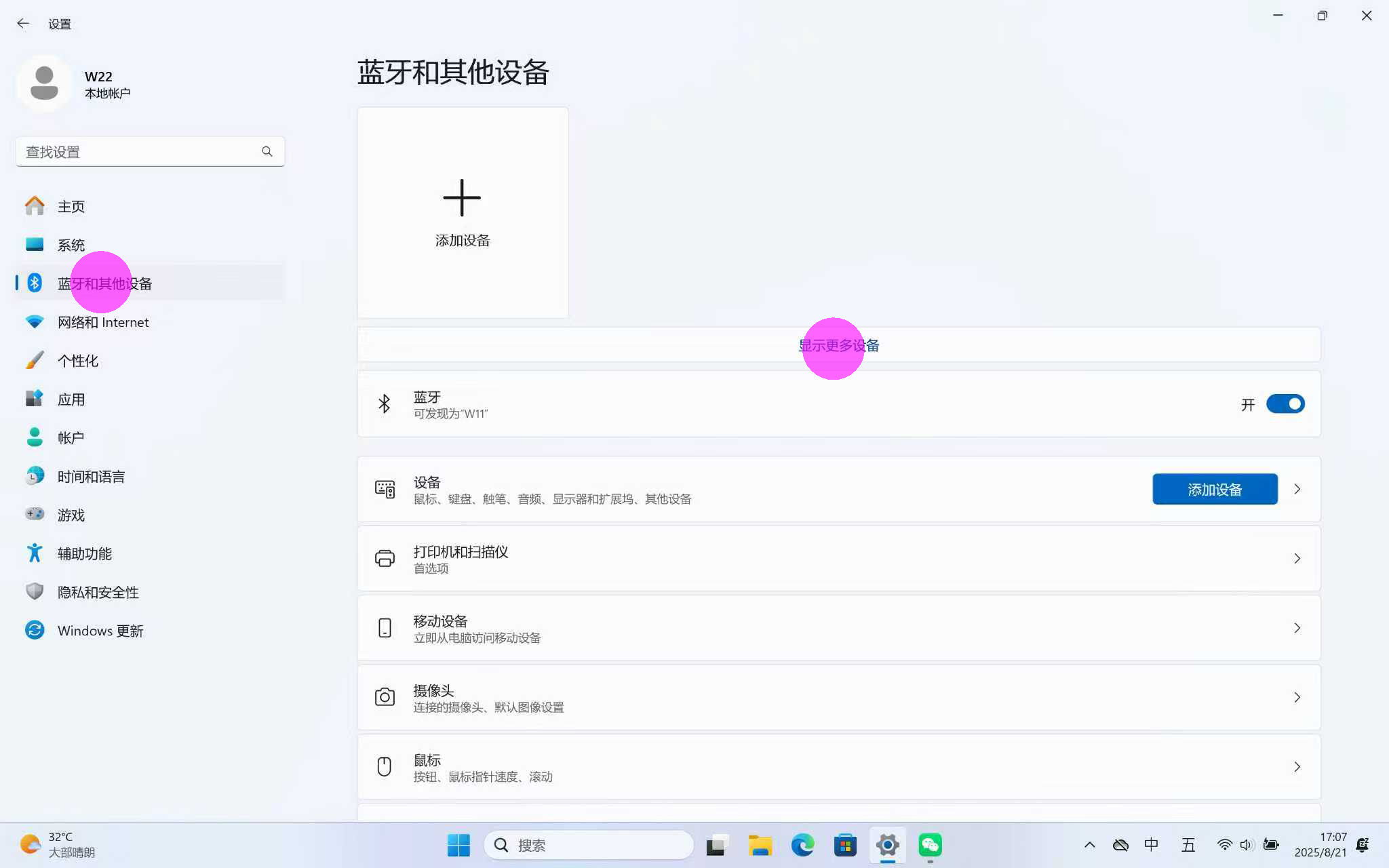 - 选“蓝牙和其他设备”项,点击“显示更多设备”项。