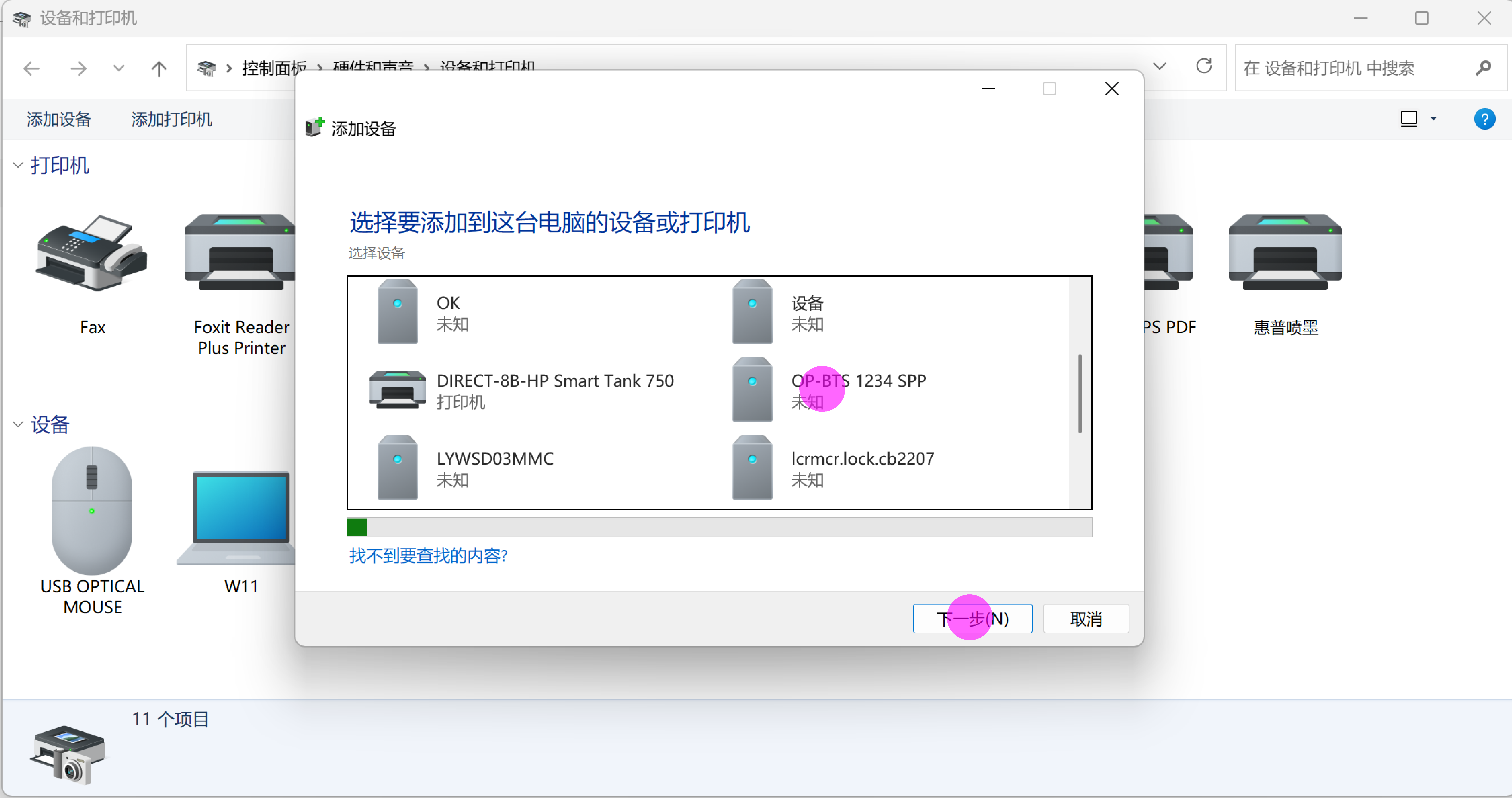 - 选经典蓝牙模式设备“OP-BTS 1234 SPP”,点击“下一步”。