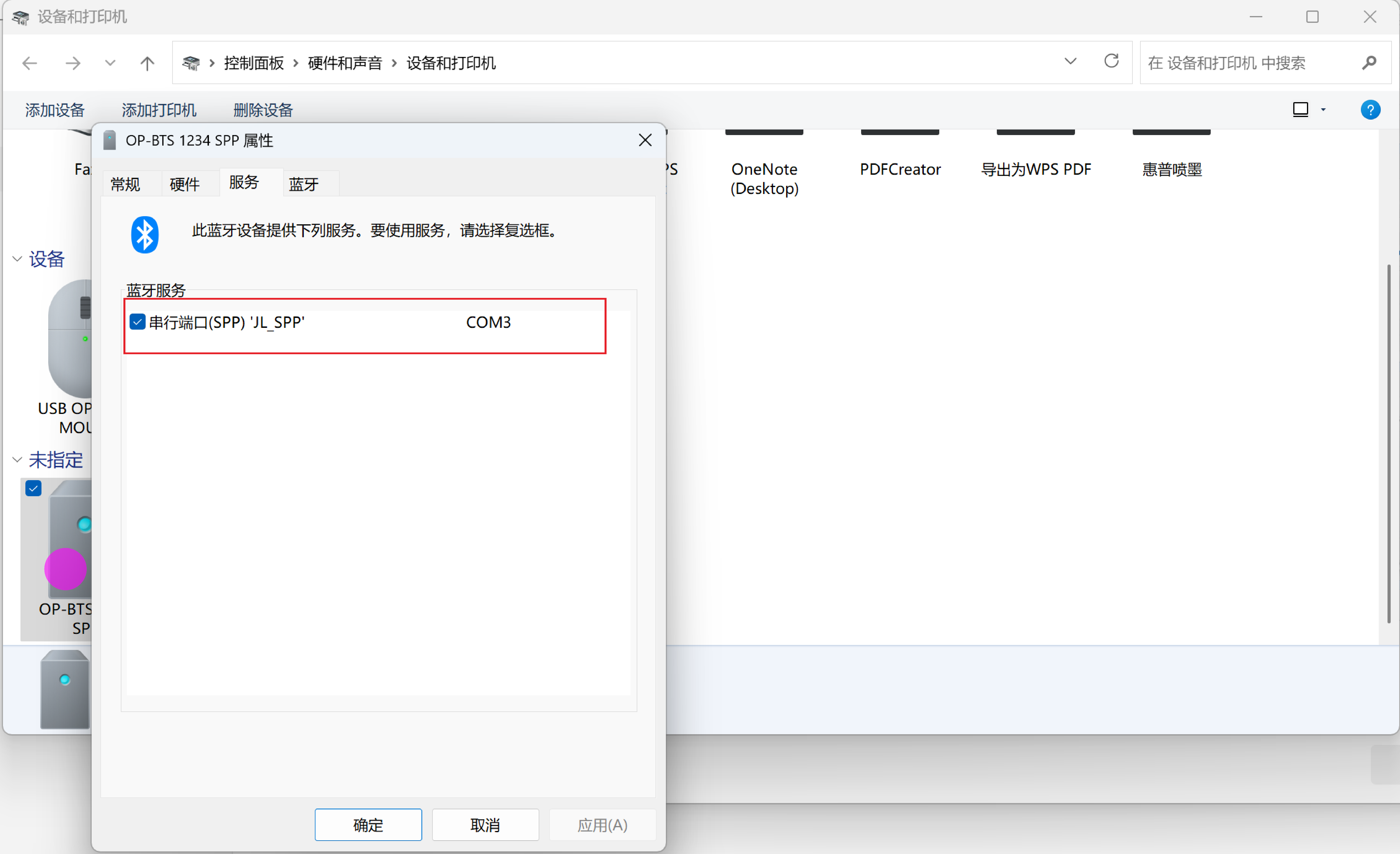 - 鼠标右击点OP-BTS 1234 SPP设备,选“属性”,然后点击“服务”项,可查看蓝牙设备生成的虚 拟串口号。在读表软件中就可以用此虚拟串口号与表计进行通讯。