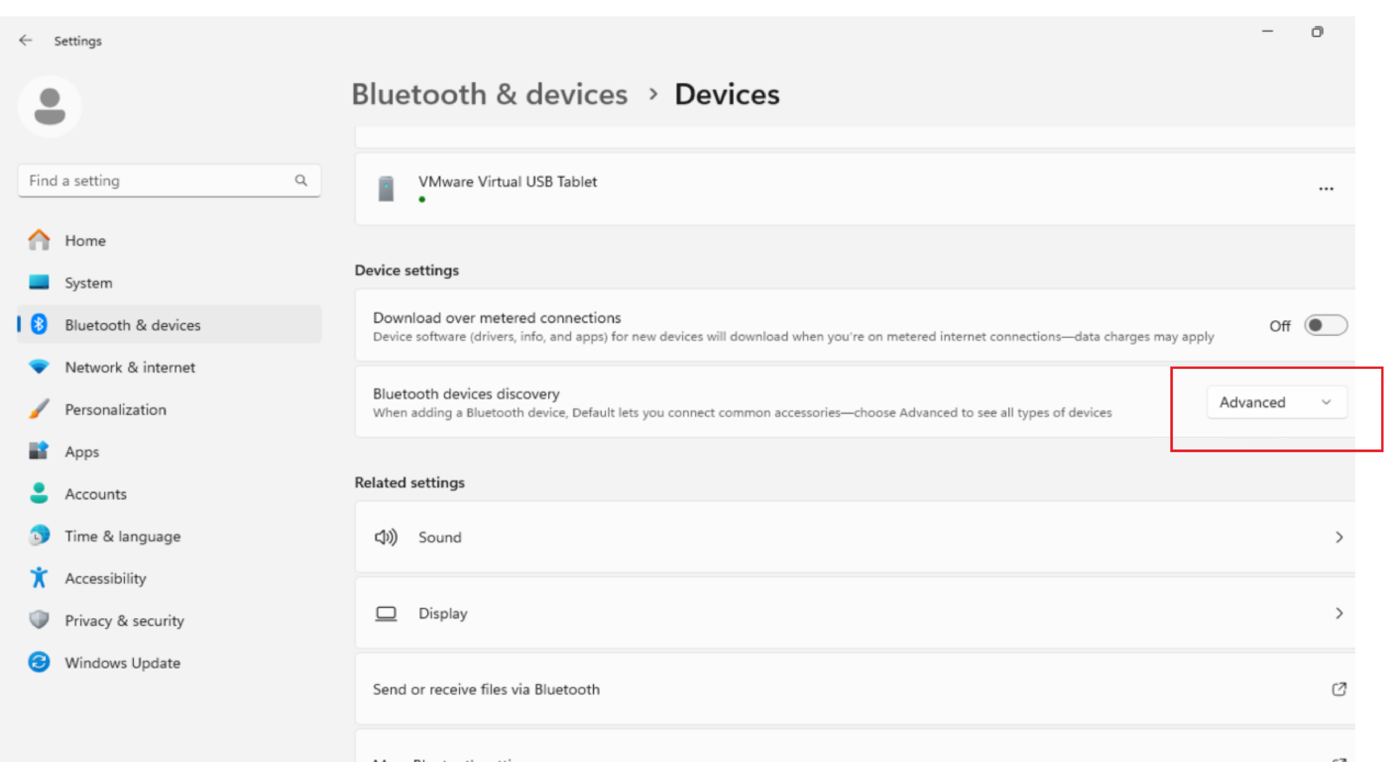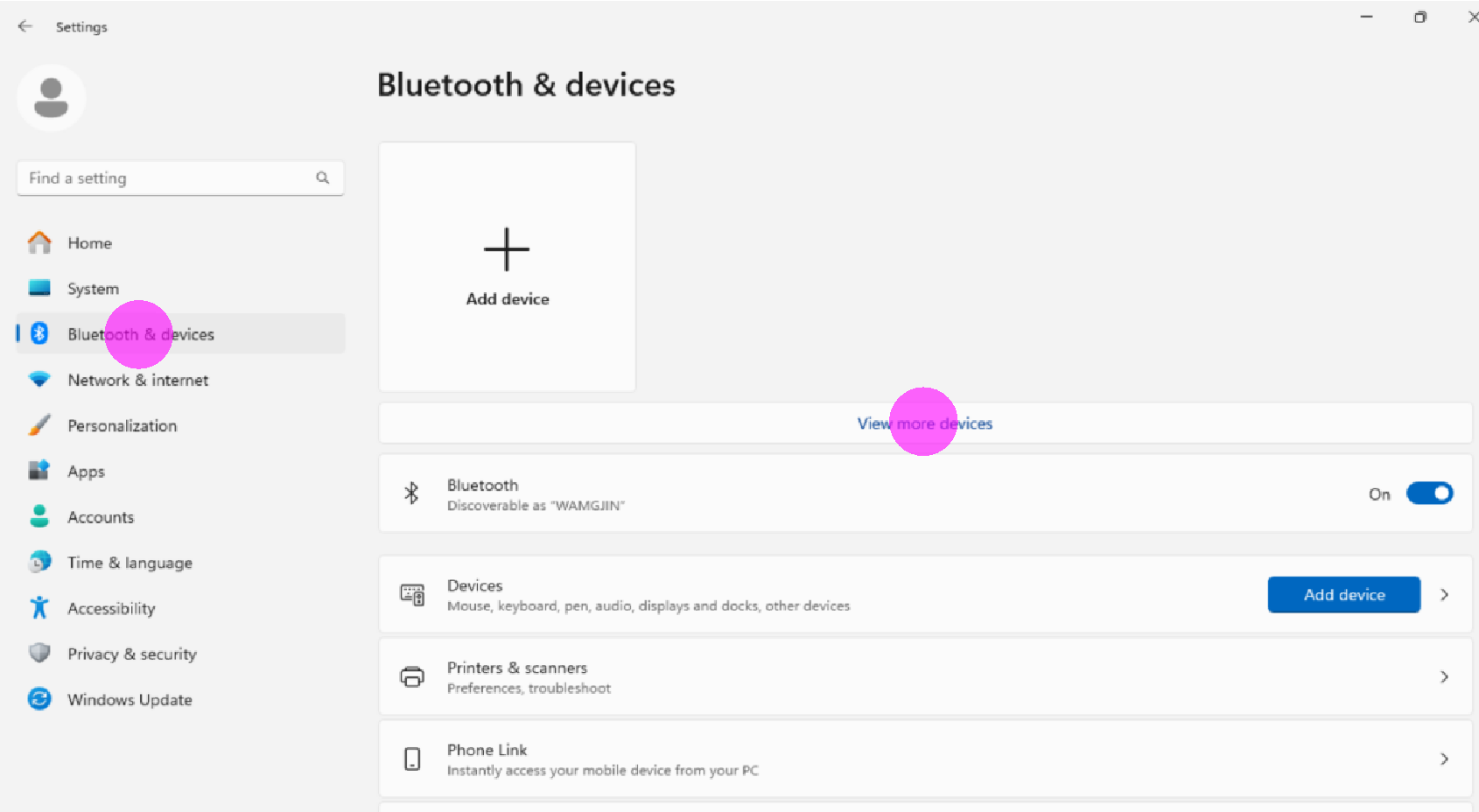 - 点击“Bluetooth & devices”选项,然后点"View more devices"击第2步选项进入显示界面中,最后将第3步的选项配置为:Advanced。